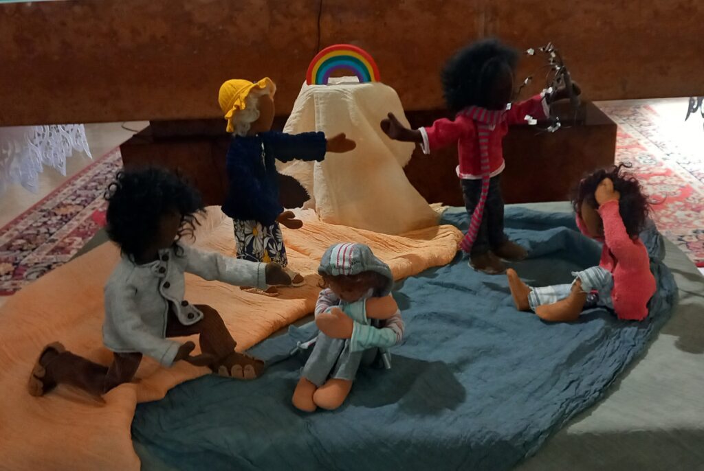 Austausch über einen Bibeltext und Stellen der Szene mit Biblischen Erzählfiguren.
