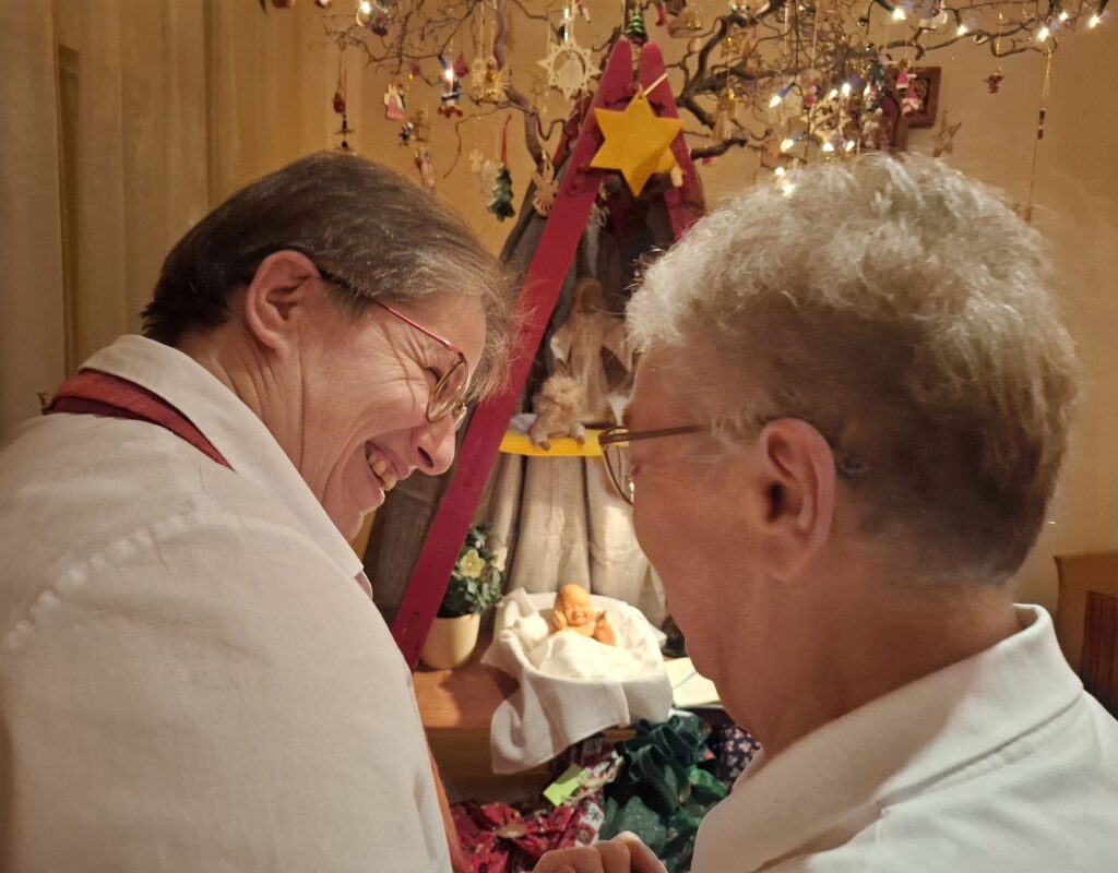In unserer gemeinsamen Weihnachtsfeier wählten wir das Thema des Heiligen Jahres: Pilger:in der Hoffnung. Zu Beginn wollten wir bewusst unseren kleinen Kreis erweitern und benannten die die Menschen, die unterwegs sind und Hoffnung suchen. Anschließend teilten wir Hoffnungsgeschichten und hörten das Weihnachtsevangelium. Nach dem Lied „Geht zu den Ställen heute Nacht“ stellten wir uns die Frage: Wohin will ich in den nächsten Tagen gehen – in welchen Stall – und fassten einen konkreten Vorsatz. Danach folgten die Weihnachtswünsche und ein gemeinsames Beisammensein mit dem Austausch von kleinen Geschenken.
